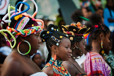 υπομονετικά, καθώς οι τεχνίτριες δημιουργούν εντυπωσιακά χτενίσματα με πολύχρωμες κλωστές και χάντρες στα μαλλιά τους, κατά τη διάρκεια του 9ου διαγωνισμού Afro-hairdresser.